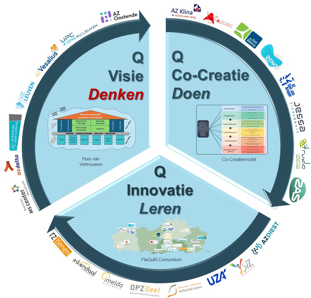 Samen met 19 leden van het consortium ontwikkelden we de FlaQuM-Quickscan, dewelke wetenshappelijk is gevalideerd op basis van meer dan 16.000 vragenlijsten. Met dit meetinstrument kunnen organisaties hun huidige visie op patiënten-, naasten- en medewerkerszorg in kaart brengen. Daarbij worden patiënten, naasten, eigen zorgverleners en collega’s uit de eerste lijn betrokken. Zo komen organisaties tot een multistakeholderperspectief.