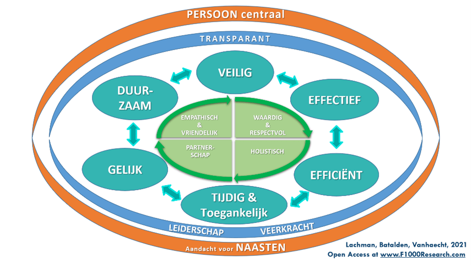 Binnen FlaQuM starten we onze visieontwikkeling vanuit een multidimensionaal kwaliteitsmodel. Dit model werd door ons team internationaal gepubliceerd in F1000 Research (Lachman et al., 2021) en doorontwikkeld binnen het FlaQuM consortium. We gebruiken het model nu als onderdeel van ons visiemodel en noemen het ons “Huis Van Vertrouwen”. Patiënten, naasten en medewerkers zullen steeds meer vertrouwen krijgen in onze organisatie wanneer we inzetten op de verschillende onderdelen van het Huis.