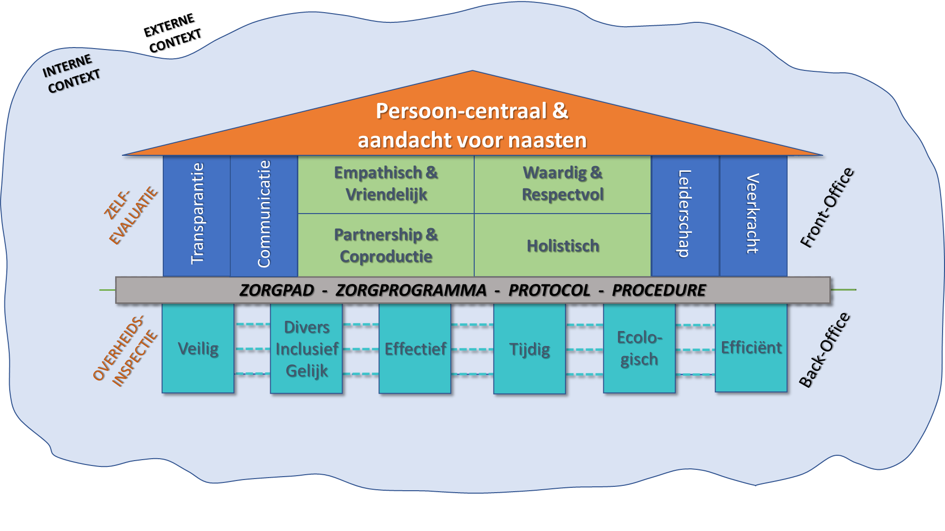 Centraal in het Huis staat onze aandacht voor de basiswaarden voor goede zorg: waardigheid & respect, holisme, partnership & coproductie en empathie & vriendelijkheid. Om zulke zorg te kunnen leveren of om op deze wijze met elkaar om te gaan binnen het multidisciplinaire team, moeten de technische dimensies van kwaliteit op orde zijn: veilig, divers-inclusief-gelijk, effectief, tijdig, ecologisch en efficiënt. Dit zijn als het ware de funderingen van het Huis die de basis moeten vormen van onze zorgpaden, procedures en protocollen. Wanneer we over dit alles transparant communiceren en aandacht hebben voor leiderschap en veerkracht, dan kunnen we continu werken aan persoonsgerichte zorg met aandacht voor zowel de patiënt, de naasten als onze medewerkers.