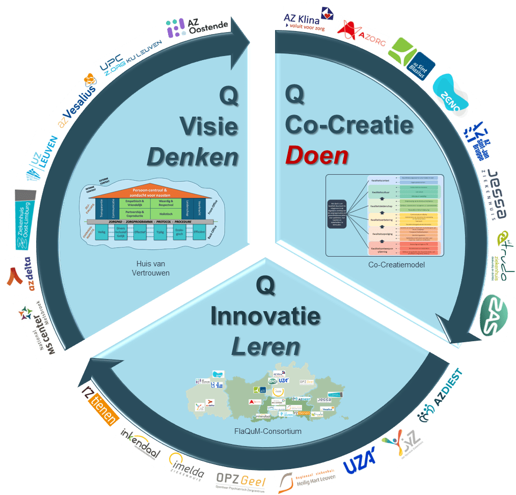 We starten de co-creatie met het uitwerken van een kwaliteitsontwerp en -plan in de eerste driver. Hiervoor gebruiken we de data uit het visiemodel (FlaQuM pijler 1) en laten we stakeholders (patiënten, naasten, medewerkers en eventueel ook eerstelijnszorgpartners) mee de prioriteiten in kwaliteit bepalen. In een tweede driver leggen we de nadruk op de kwaliteitsopvolging en meten en controleren of we voldoen aan externe en interne normen en eisen. Op basis van deze bevindingen werken we vervolgens aan kwaliteitsverbetering waarbij evidentie en teamwerk cruciaal zijn. Dit alles is pas mogelijk als zowel alle bedside medewerkers, medewerkers van de ondersteunende diensten, het middelmanagement én de directie en het bestuur hun kwaliteitsleiderschap tonen. Zo kunnen we streven naar een kwaliteitscultuur, dewelke de vijfde driver van het co-creatiemodel vormt. De zesde en laatste driver is de kwaliteitscontext, deze omvat zowel de interne als externe context die een invloed kan hebben op de vijf onderliggende drivers.