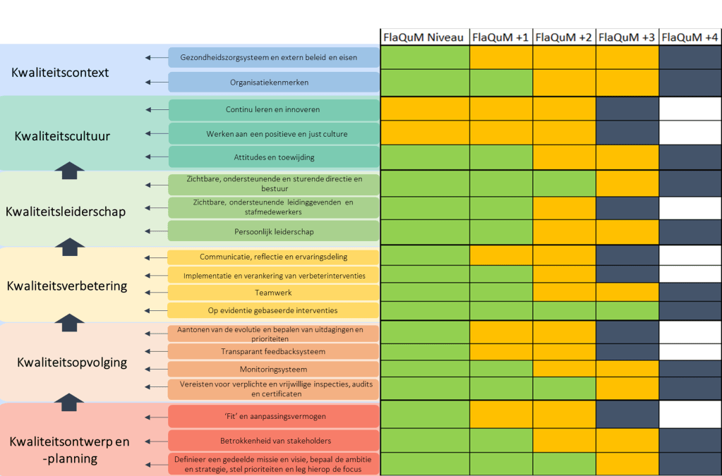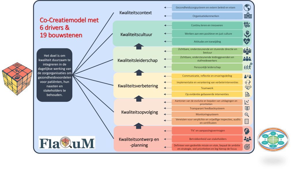 Het FlaQuM Co-Creatiemodel is gepubliceerd in PLOS ONE en opgebouwd op basis van een stapsgewijze wetenschappelijke methode waarbij er enerzijds kennis is geïntegreerd uit interviews met nationale alsook internationale experten in kwaliteit en er anderzijds een onderbouwing uit de literatuur heeft plaatsgevonden op basis van 59 internationale publicaties van toonaangevende kwaliteit- en patiëntveiligheidsinstituten (Claessens et al., 2021). De 6 drivers en 19 bouwstenen zijn gebaseerd op modellen en methoden uit de brede kwaliteitsliteratuur. Ieder van de 104 actievelden is onderbouwd door minimum drie recente, internationale publicaties.