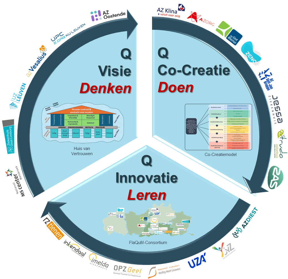We starten de co-creatie met het uitwerken van een kwaliteitsontwerp en -plan in de eerste driver. Hiervoor gebruiken we de data uit het visiemodel (FlaQuM pijler 1) en laten we stakeholders (patiënten, naasten, medewerkers en eventueel ook eerstelijnszorgpartners) mee de prioriteiten in kwaliteit bepalen. In een tweede driver leggen we de nadruk op de kwaliteitsopvolging en meten en controleren of we voldoen aan externe en interne normen en eisen. Op basis van deze bevindingen werken we vervolgens aan kwaliteitsverbetering waarbij evidentie en teamwerk cruciaal zijn. Dit alles is pas mogelijk als zowel alle bedside medewerkers, medewerkers van de ondersteunende diensten, het middelmanagement én de directie en het bestuur hun kwaliteitsleiderschap tonen. Zo kunnen we streven naar een kwaliteitscultuur, dewelke de vijfde driver van het co-creatiemodel vormt. De zesde en laatste driver is de kwaliteitscontext, deze omvat zowel de interne als externe context die een invloed kan hebben op de vijf onderliggende drivers.