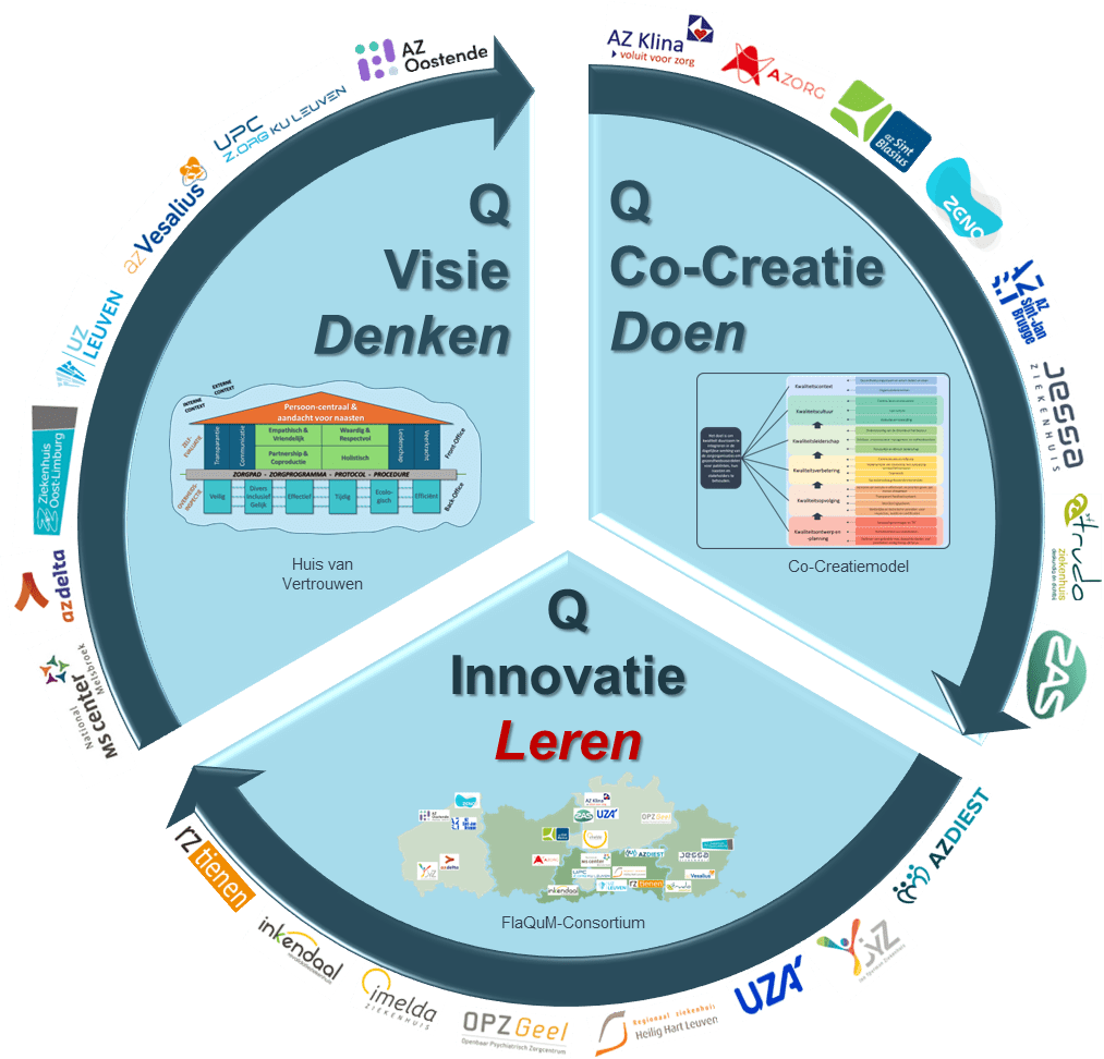De derde pijler van het Flanders Quality Model is kwaliteitsinnovatie, ofwel leren. Leren doen we samen op basis van op evidentie gebaseerde modellen, tools en technieken. We doen dit ten eerste intern in elke FlaQuM organisatie. Teams leren en inspireren elkaar uit zowel best practices als uit bijvoorbeeld incidenten. De organisaties voeren interne audits uit en controleren daarbij of ze voldoen aan interne en externe eisen, protocollen en procedures. We leren daarnaast over de FlaQuM-modellen en interpreteren samen de scores op de FlaQuM-Quickscan en de objectieve kwaliteitsindicatoren vanuit het visiemodel, alsook uit de Maturiteitsmatrix en Sneltest vanuit het co-creatiemodel.